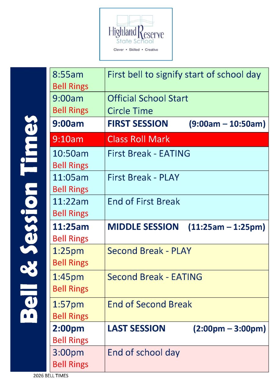 Highland Reserve State School operating hours and class times are listed below.